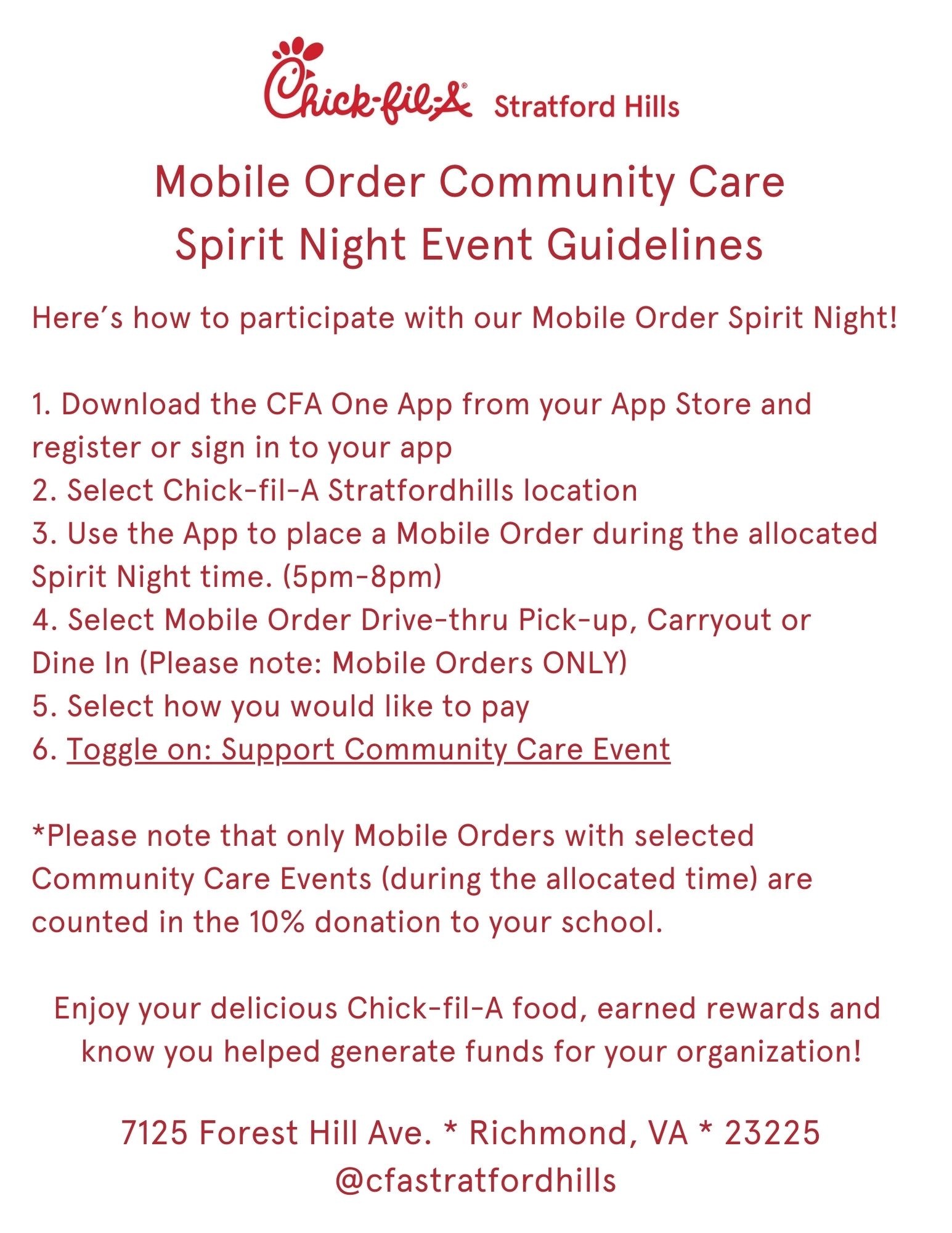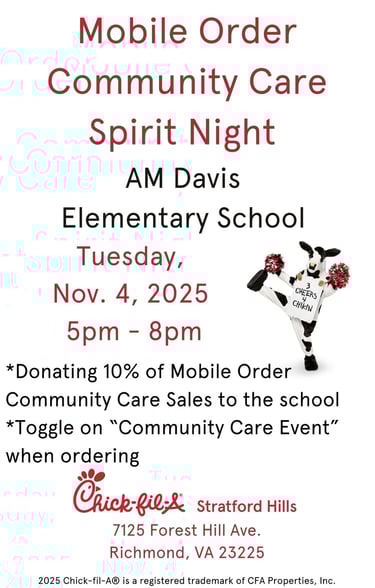 11/4 5:00pm - 8:00pm Chick-fil-a Stratford hills @ 7125 Forest hill ave (Online ordering only! See How to order by clicking Here)